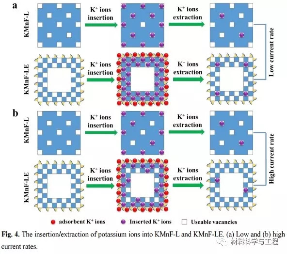 由于K和F空位的存在,这个特殊结构可以容纳由于钾离子插入引起的体积膨胀,进而提高KIBs的容量、倍率性能和循环稳定性。同时,该研究表明KMnF-NCs的晶体结构缺陷对刻蚀反应具有重要影响。在可逆充放电过程中,该片层结构包覆的空心纳米块可以提供较大的比表面积并具有赝电容特性,进而使材料具有展现出高容量、高稳定性和优秀的倍率性能。