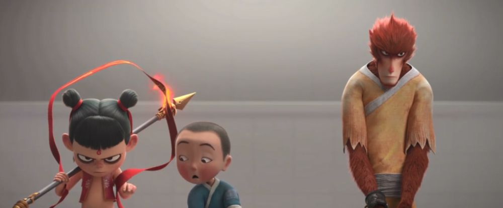 在《哪吒》正式上映之前,他们还合作推出了特别预告。把《大圣归来》中江流儿问猴子:“哪吒是男孩吗?”“女的!”这个场景重新演绎了一次。