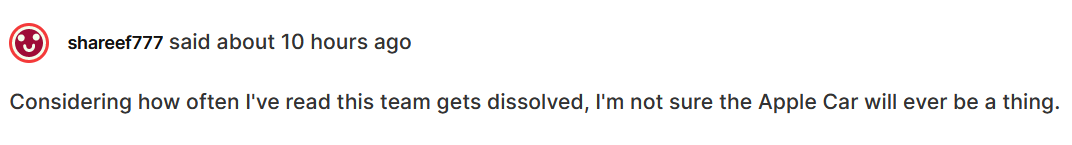 有网友表示悲观:「想到这是我第n次看见Apple Car团队解散的消息,我真的很怀疑Apple Car到底会不会问世。」