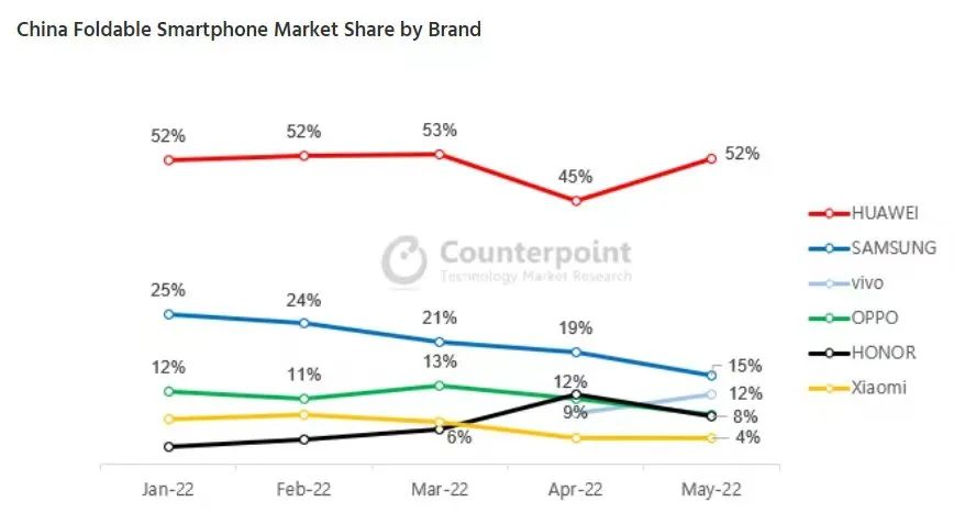 市场调研机构Counterpoint公布数据,今年1-5月,华为占据中国折叠屏手机销量的50%,其次是三星占比20%,OPPO 和小米分列第三和第四。4月以来,vivo进入市场,基于4月和5月的销售情况看,vivo以10.3%的市场份额显示出良好的开端。(IT之家)