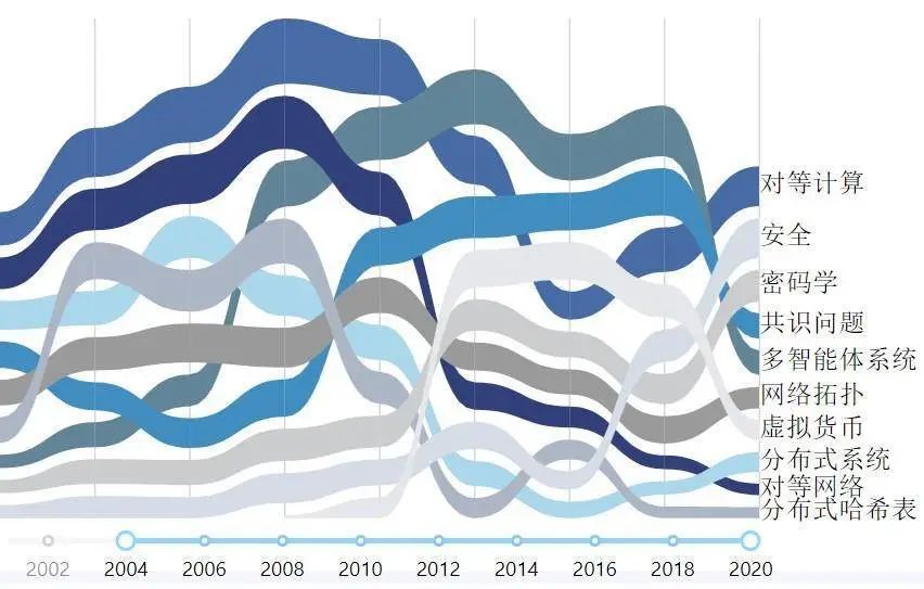 上图中的每个颜色表示一个领域分支术语,其宽度表示该术语在当年的热度,与当年该分支领域的论文数量呈正相关;各分支在每一年份中按照其热度进行排序,越热的在越上方。对目前热度靠前的 10 个分支领域进行历史热度展示,从趋势图中可以看出,“共识问题”的研究热度持续增加,一直处于“区块链”热点趋势的前列。“对等计算”、“安全”、“分布式系统”和“密码学”也是“区块链”领域的重要分支领域。
