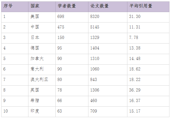 图 | 全球区块链领域学者数量排名前 10 的国家(来源:科技情报大数据挖掘与服务系统平台 AMiner)