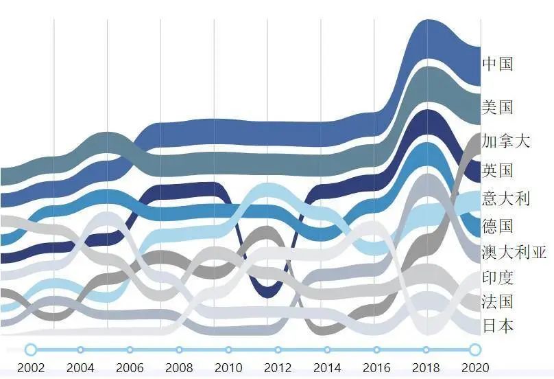 此外,还可以根据 AMiner 平台分析不同国家在 “区块链” 领域的趋势,图中每条色带表示一个国家,其宽度表示该国家在当年的研究热度,与当年该国论文数量呈正相关,每一年份中按照其热度由高到低进行排序。通过国家趋势分析可以发现当前 “区块链” 领域研究热度 Top10 国家分别为:中国、美国、加拿大、英国、意大利、德国、澳大利亚、印度、法国和日本。