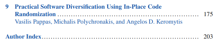 最后,在第九章,Pappas等人描述就地代码随机化,一种可以直接应用于第三方软件的软件多样化技术。它们演示了就地代码随机化如何强化固有易受攻击的 Windows 7 应用程序,并提供概率保护以防止面向返回的编程 (ROP) 攻击。