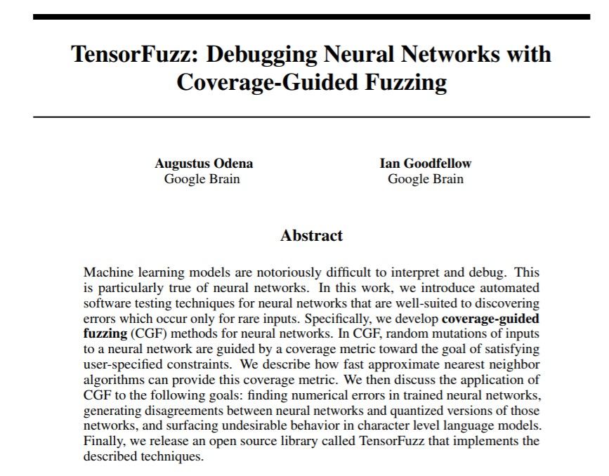 谷歌大脑团队为神经网络引入了覆盖引导模糊的概念,并描述了如何在此背景下构建有用的覆盖率检查器。他们通过查找数值误差、神经网络与其量化版本之间的分歧,以及揭示 RNN 的不良行为,证明了 TensorFuzz 的实用性。他们发布了 TensorFuzz 库,让其他人可以基于现有的工作继续研究,或使用模糊器来找出真正的问题。