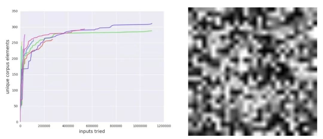 他们用一些不安全的数值运算训练了一个 MNIST 分类器,然后对来自 MNIST 数据集的随机种子运行 10 次模糊测试。模糊器每次运行都发现了一个非限定元素。左图:运行时模糊器的累计语料库大小,运行 10 次。右图:模糊器找到的图像示例。