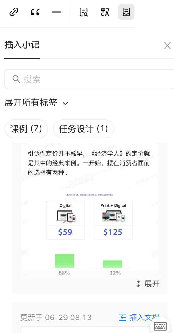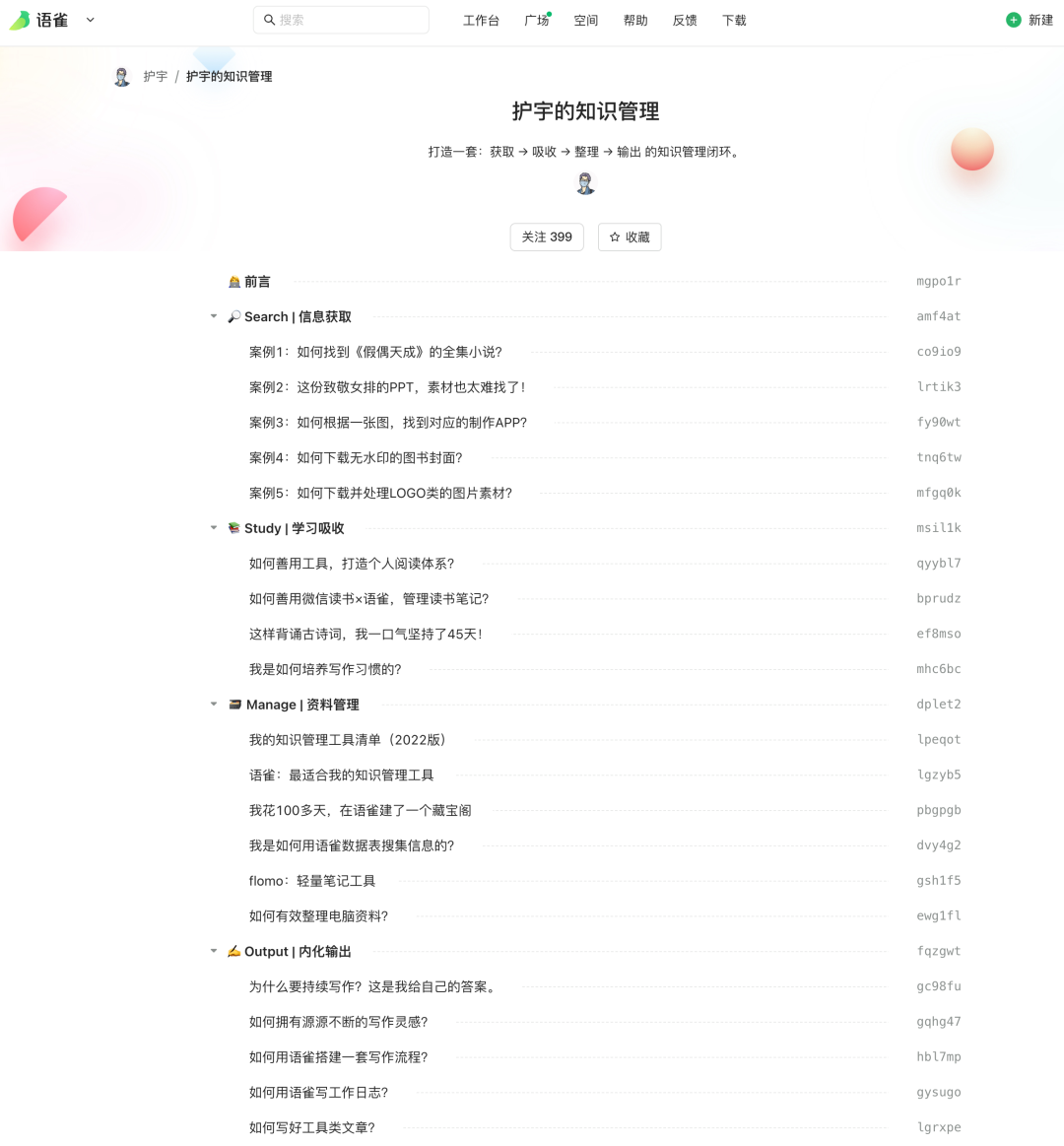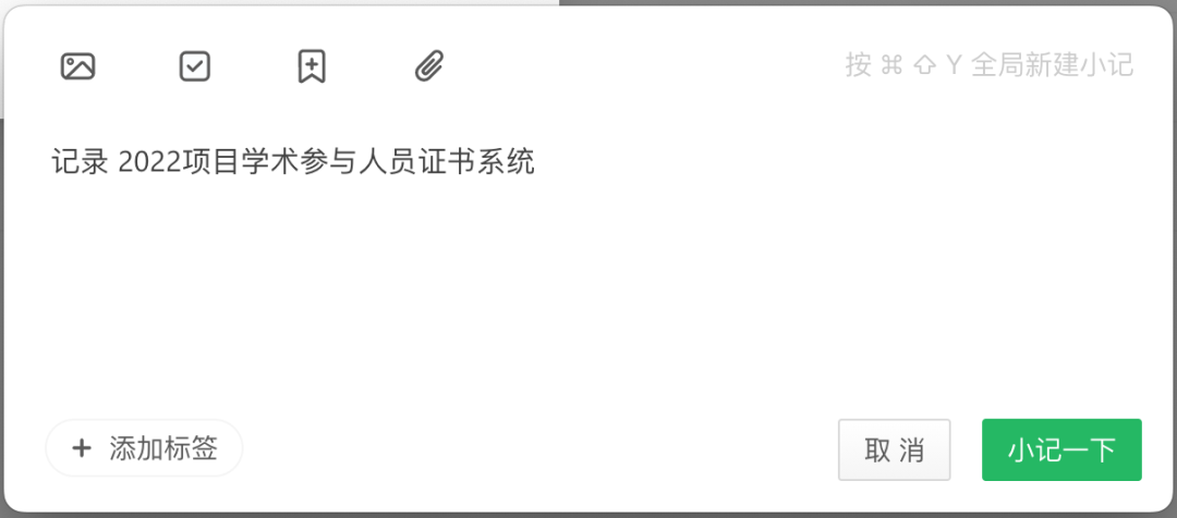 而之所以在繁多的选择中,语雀(yuque.com)最终能让我投入最多时间、委以最多重任,正是因为它的设计理念和功能架构,以令我满意的方式回应了上面那些问题。如果要让我用简短的方式向别人介绍语雀,我会用「来—理—去」三个字来概括。这个说法不是我的原创,而是语雀团队介绍「语雀小记」产品时最初阐述的,但在我看来也适用于描述语雀整个产品,即强调从记录、到整理、再到形成结构化知识的全流程。接下来,我就以这个「来—理—去」的策略为线索,结合实际工作案例,介绍一下语雀为什么能让我得心应手地管理和输出信息。▍来:信手拈来、功不唐捐从事教育工作,出门开会和听课是常有的事。这种时候,电脑上往往一边要打开幻灯片,一边要处理工作消息。如果再单独开一个 Word 窗口做记录,对于狭小的笔记本屏幕来说实在勉为其难了。这时,语雀的小记功能就非常合适。它不需要占用固定的桌面空间,可以通过固定的快捷键 Command + Shift + Y 随时召唤出来,随用随走;而如果需要边对照其他窗口边记录,又可以「钉」在屏幕最上方,不会被乱七八糟的窗口所遮挡。小记虽然界面轻量,但能承载的内容很多。不论是一段超链接,又或许讲座里拍摄的几张照片、一小段视频,都能在里面找到合适的位置。还有很多时候,人还在路上,微信里就发来一条条工作安排。这时,我并不会急着处理,而是随手从微信聊天中复制关键信息,发给语雀的公众号。事后回到桌边,这些只言片语都会在小记中等着你继续处理。尽管看起来是很简单的功能,但这种信手拈来的可靠感是非常重要的。▍理:高效编辑、极速排版