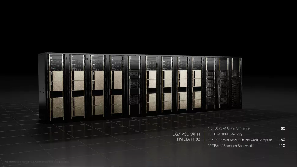 DGX SuperPOD可提供1 EFLOPS的FP8性能,同样也是前代的6倍。