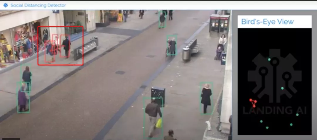 疫情期间,Landing.ai 还在其官方博客平台上发布了一款社交距离监控工具,其中包含一个演示视频,基于公开街景数据集 The Oxford Town Centre 展示了新的社交距离探测器,旨在让行人彼此之间保持至少两米的距离,尽可能减少新冠病毒的传播。