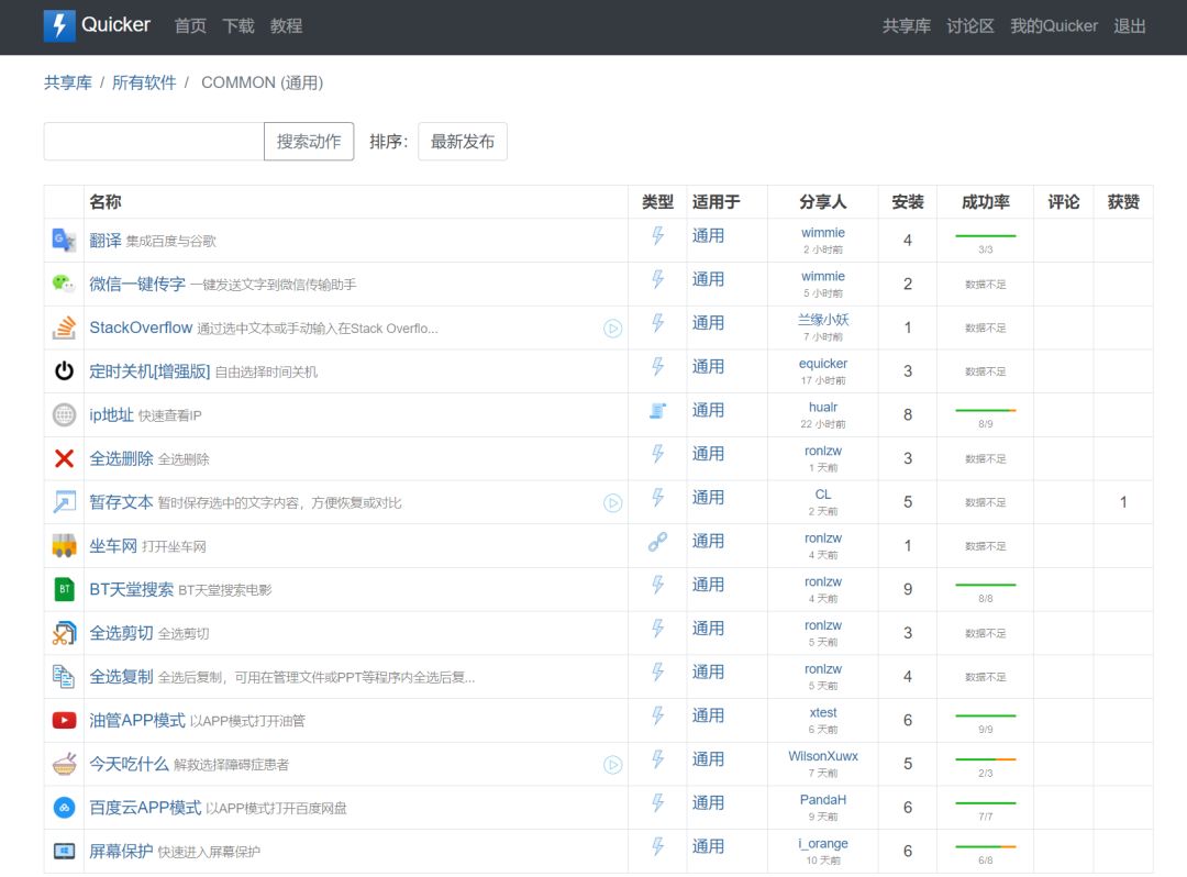 全靠自己做动作难免有些麻烦,Quicker 为此提供了一个官方的动作共享库。每个人都可以把自己做的动作分享到共享库中。