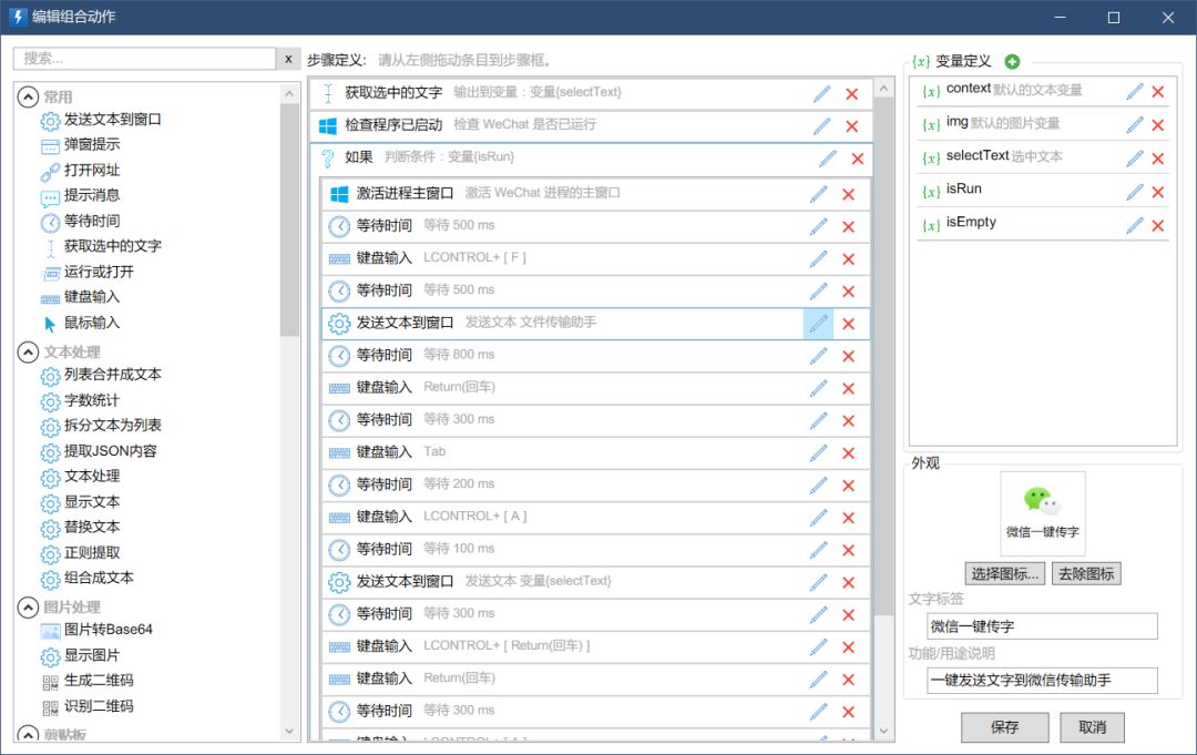 Quicker 内置了一个「组合动作编辑器」,左侧内置了丰富的快捷动作,从字数统计到执行脚本,还有「循环、判断」等逻辑动作,右侧则可以自定义一些需要用到的变量。把这些快捷动作拖到中间,组成特定的步骤就可以做出属于自己的动作了。