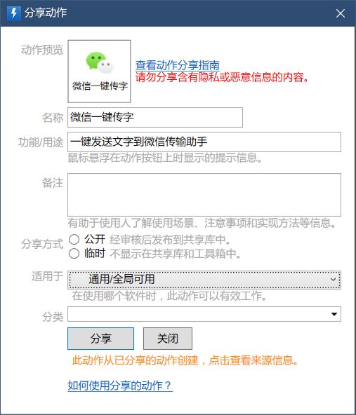 分享时可以自定义动作图标、用途、备注、分类等。分享时需要通过审核,保证分享的动作中不包含恶意代码和危险动作。如果你的动作中出现了问题需要更新,可以在原动作上修改,更新会同步到这个页面。(原动作一旦删除,便无法更新)。当你从分享库中下载动作,并在它的基础上进行修改后二次分享时会显示「此动作从已分享的动作创建,点击查看来源信息」,有效保证了原作者的权利。