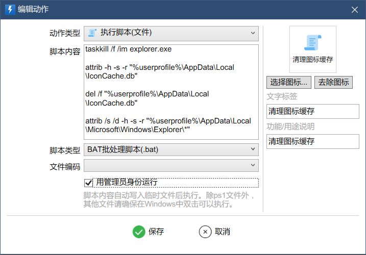 Quicker 的另一个高级动作是「执行脚本」,支持 CMD 命令、CMD 批处理、BAT 批处理、PowerShell 脚本,以及 AutoHotkey 脚本,允许直接通过管理员身份运行。所以「清理图标缓存」「定时关机」等常用的批处理命令都可以直接交给 Quicker 来运行。