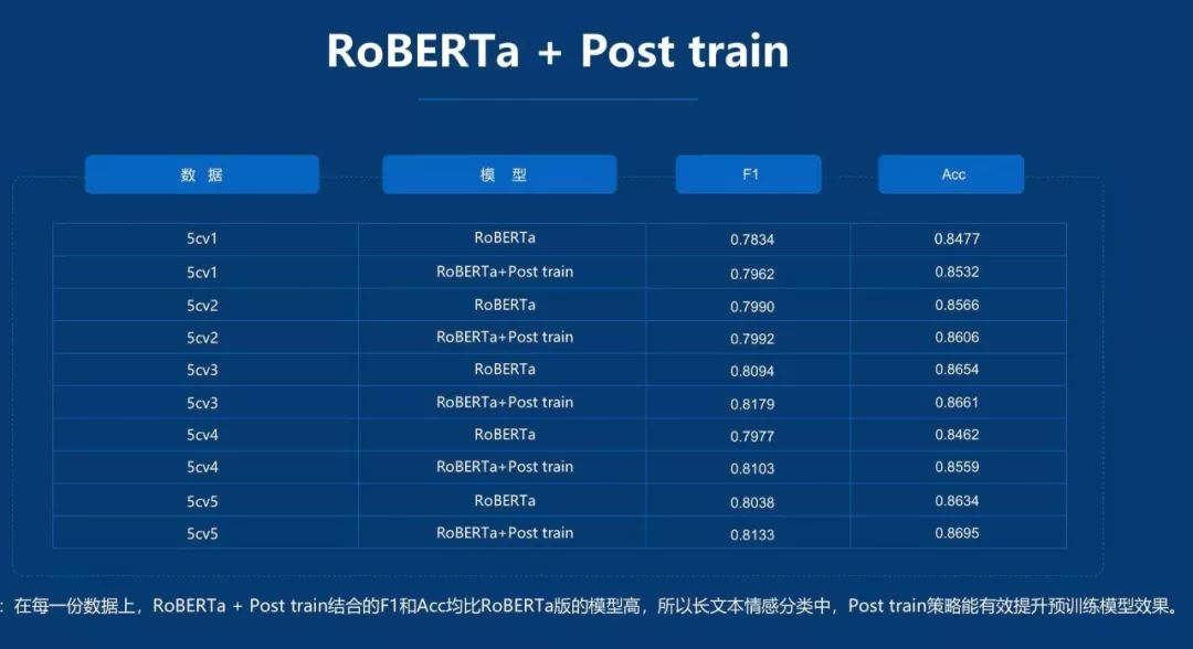 另外,百分点还采用了 post train 的方法提升模型的效果,实验结果证明,在每一份数据上,RoBERTa+ Post train 结合的 F1 和 Acc 均比 RoBERTa 版的模型高,所以在长文本情感分类中,Post train 策略能有效提升预训练模型效果。