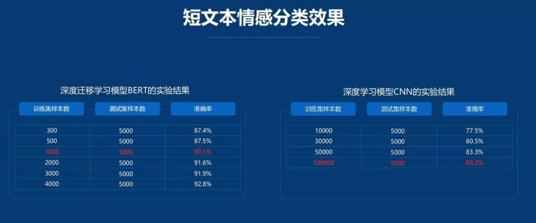 在 BERT 出现之前,团队已经意识到 CNN 模型存在的问题。苏海波补充道,这种模式对标注数据的依赖太大,一个简单的情感分类需要上万条,甚至十几万条标注数据,工作量太大,且实验过程中发现很多场景下根本无法提供这么多标注数据。对比之下,深度迁移学习可以大大降低标注数据量,通过预训练模型和大规模通用性语料,在不需要大量标注数据的情况下就可以得到不错的效果,这是一个革命性创新。