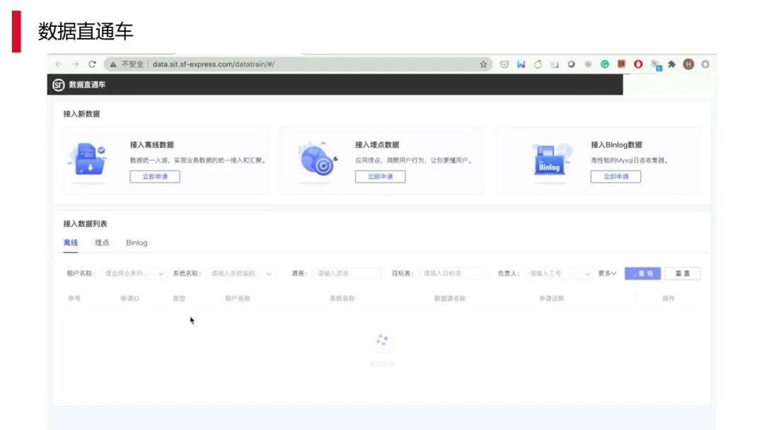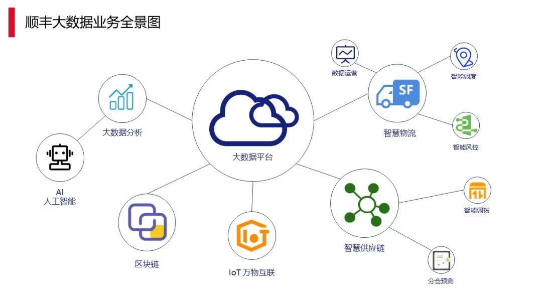 大数据平台,中间的基础部分是大数据平台,这块是顺丰结合开源组件自行搭建的。与之相关的是大数据分析与人工智能,顺丰有一个非常强的地面部队,就是线下的快递小哥以及运输车辆,需要使用 AI 以及大数据分析来辅助管理,提升整体效率。