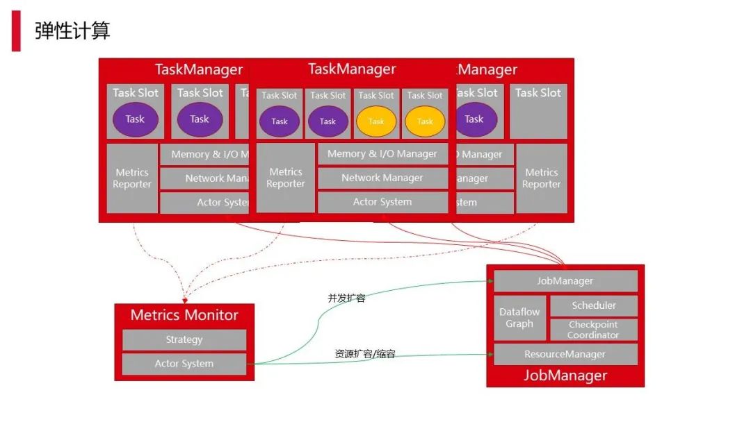 首先,弹性计算。目前像监控任务,用户申请的资源远远超过实际需要使用的资源,会造成严重的资源浪费,内存也一样。处理类似情况时,我们使用了 Flink 延伸的框架 Metrics monitor,结合采集的 Metrics,能够做到当整个使用率过低或过高的时候,及时调整达到资源扩缩容或者并发扩容。