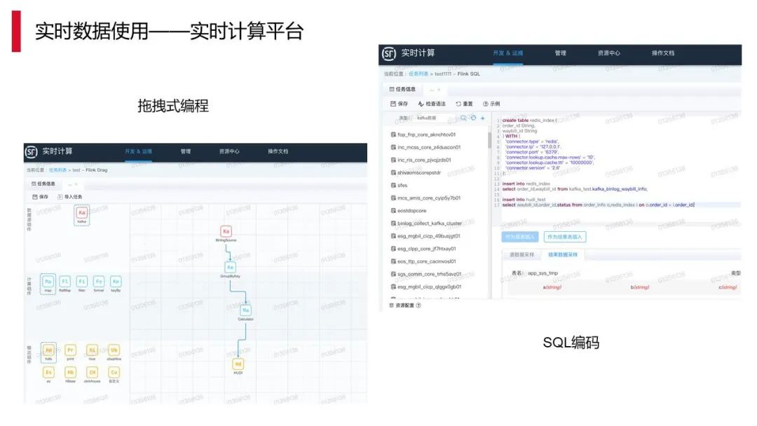 我们在平台上也做一些简化的内容,首先有一部分是关于拖拽的,拖拽是指封装一些组件,用户可以通过拖拽来快速完成其需求。这个产品上线后,很多之前没有任何实时计算的经验,甚至连离线开发的经验也没有的用户都能够做实时的数据开发。