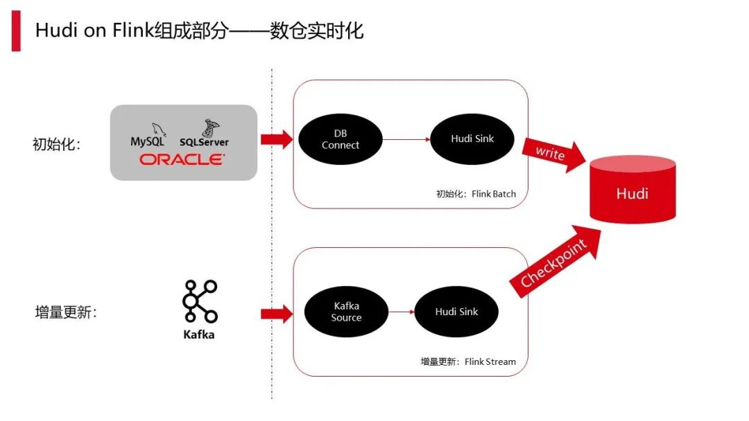 其实整个过程,比如做表数据实时化的时候,它是分为两部份,一部分数据初始化,在启动的时候,会把数据重新做批量的拉取,这个是用 Flink batch 来做的,其实社区本身也有提供这种能力。另外 Hudi 本身也具备把存量的 Hive 表 Hudi 化的能力,这是 Hudi 最新才出来的功能。这部分我们会用 Flink batch 的方式重新抽一遍,当然也有存量,对于存量的一些表,可以直接用存量表来转化,然后用 Flink batch 做初始化。