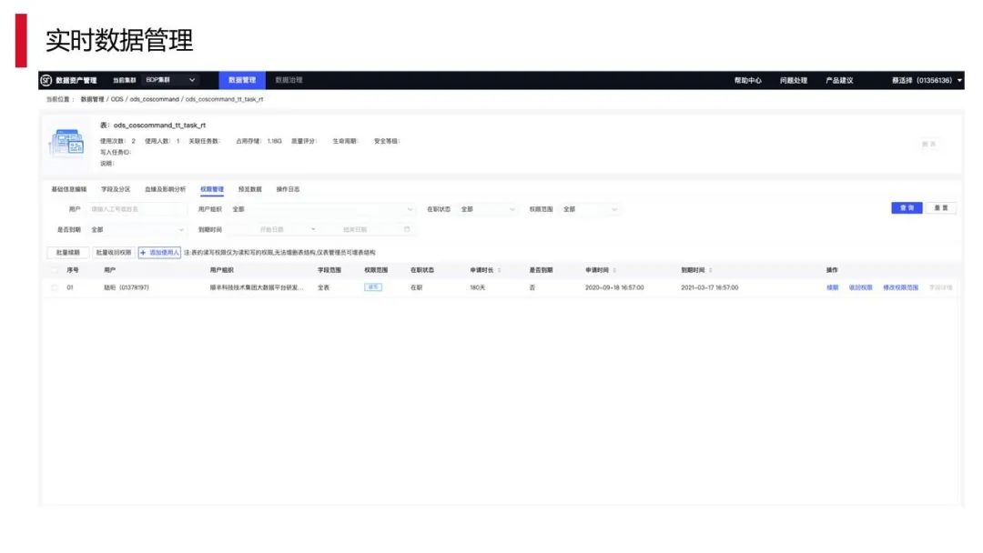 另外,数据接入进来之后,需要有数据管理的能力。上图是数据管理能力测试环境的简单情况,我们需要让用户能够管理相关的数据,首先谁用它了,其次它涉及什么字段,有哪些具体的内容,同时它里面的血缘关系又是怎么样的,这个就是我们数据资产管理所具备的功能。