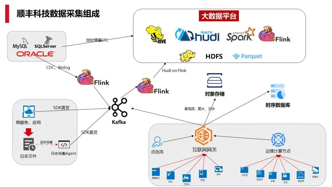 数据存储计算:实时这块顺丰目前用的最多的还是 Flink,Storm 没有标示出来,目前我们在做迁移。消息中间件处理目前主要使用 Kafka。然后右边存储结构的种类就相对丰富,因为不同的场景有不同的处理方式,比如数据分析需要性能比较强的 Clickhouse;数仓和离线计算这块还是比较传统,以 Hive 为主结合 Spark,目前我们是结合 Flink 与 Hudi 去实现离线实时化。