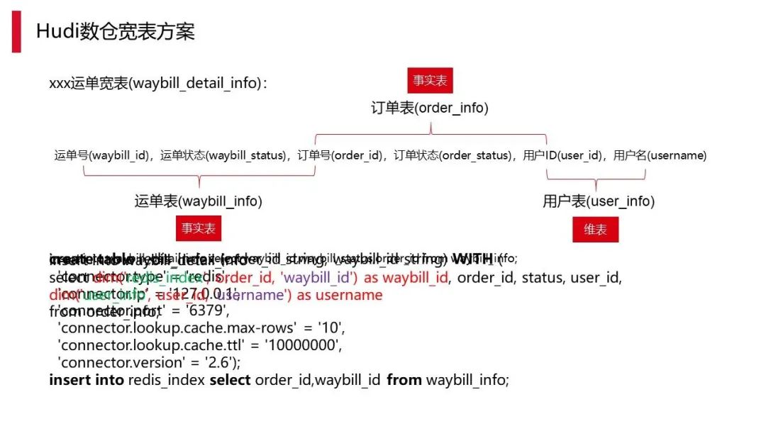当然,做维表关联,就涉及到外键主键的映射。外键主键映射是为了让我们能够在另一个事实表更新时,快速找到主键在哪,即外键主键的映射 。另外主键索引,主键索引其实也是跟外键主键的映射相关。至于外键主键的映射,相当于把它建成一个新的表主键索引获取,这样增量更新 Hudi 跟原来的 ODS 层就基本上一致了,这就是宽表实时加工的过程。下图为运单的宽表举例。