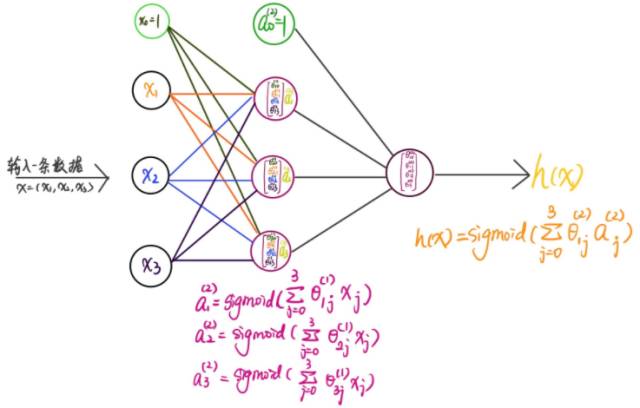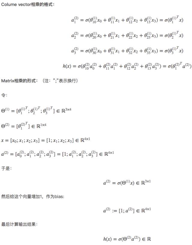 下面,我们把这一系列的计算公式展开来,然后再合并成colume vector相乘的格式,最后再合并成matrix相乘的形式。sigmoid函数用