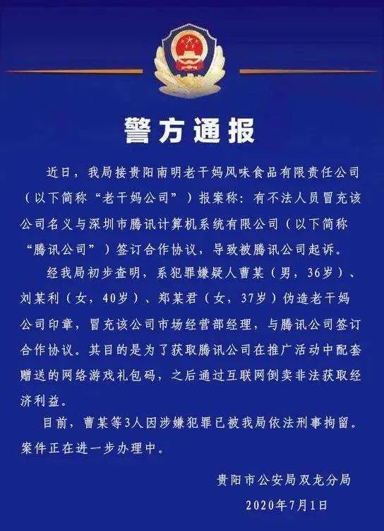 贵阳警方通报:3 人伪造老干妈印章与腾讯签订合同,已被刑拘