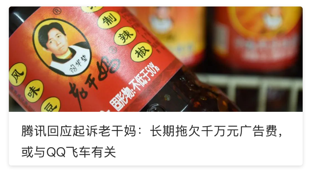 据了解,2019年3月,腾讯与老干妈公司签订了一份《联合市场推广合作协议》,腾讯侧投放资源用于老干妈油辣椒系列推广。