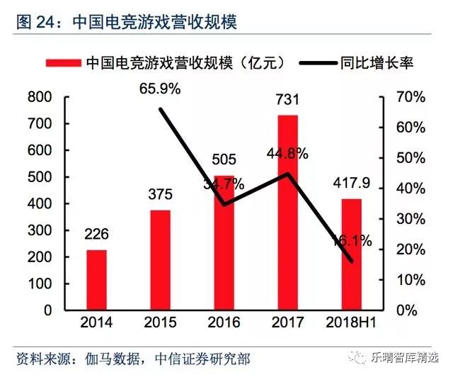 游戏市场方面,2018H1中国电竞游戏市场规模达417.9亿元,同比增长16.1%,其中端游/移动电竞游戏收入分别为192.2/225.7亿元,同比增长4.8%/27.9%,占比达46.0%/54.0%,移动电竞游戏是主要增长力。