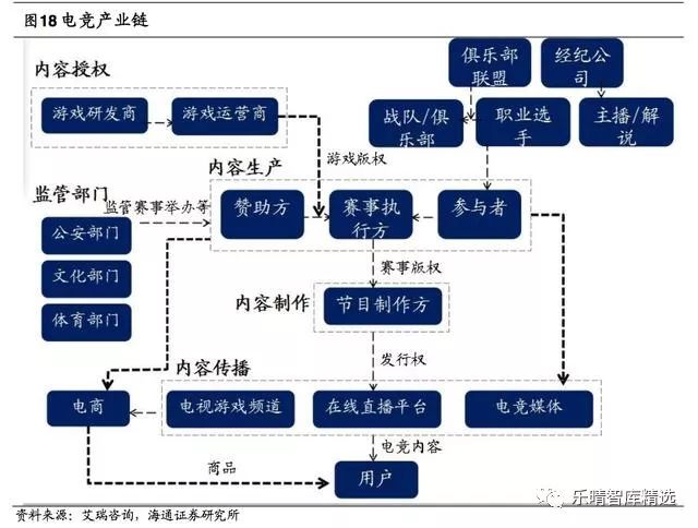 移动电竞产业链在内容上与移动游戏的产业链略有不同,由于加入了电竞赛事运营和职业选手俱乐部的因素,同时考虑到移动电竞的观众并不一定都是游戏玩家,所以也需要借助相应的直播平台与赛事媒体进行内容的传播,所以从产业链的形式上来看更接近于NBA、足球欧洲冠军联赛等传统职业体育赛事。