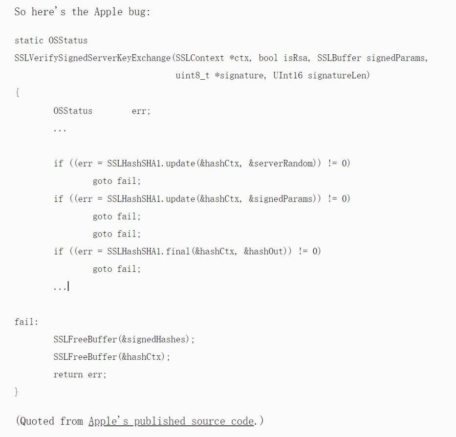 Guido:代码缩进(Indentation)其实并不是我发明的,当时的同事给了我启发。在 Python 中要求进行代码缩进的原因是 30 年前的代码编辑器都不能很好地对代码进行缩进排版,所以我就想鼓励程序员自己来对代码进行正确的排版,从而确保程序员从视觉上对代码的理解与编译器对代码的解析是一致的。这其实非常重要,几年前苹果公司就发生过一次非常严重的代码安全漏洞事故,就是由于代码中一个语句与程序员实际设想的 if-else 语法逻辑没有匹配而引起的,如图 1 。其实,严格要求代码缩进确实有点夸张,改用花括号,也不是不可以。