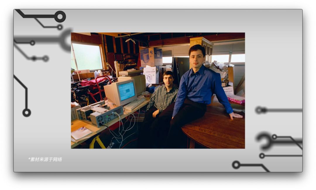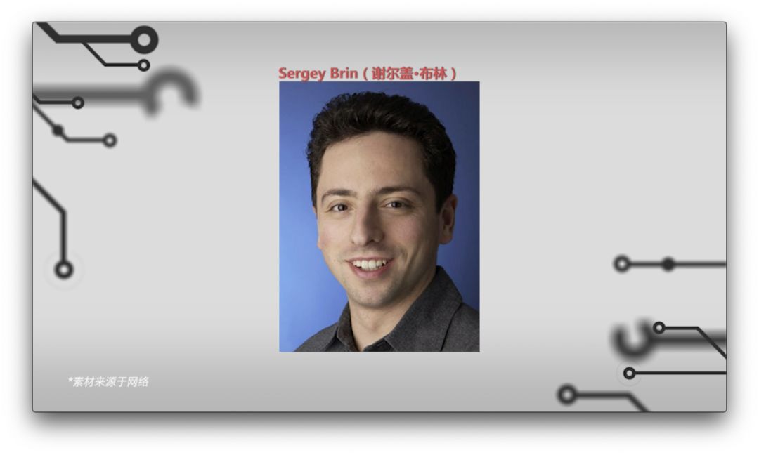 所以说再次强调家庭教育的重要性,为什么 12 岁的 Larry Page 读的是 《尼古拉·特斯拉传》,而我小时候读的是 《十万个为什么》,像我们的制片人高高同学,居然已经开始读《安妮宝贝》了。所以说小时候读什么书真的是能够影响一个人未来成为什么样的人。你读《安妮宝贝》,你就是文青,像读 《十万个为什么》 就是一个主播。所以 Page 之所所以会在小时候读到这部伟大的自传,归功于 Page 的爸爸。老 Page 正是一位通信科学的博士,老 Page 很早就对小 Page 熏陶和传达了许多科学概念,甚至带着 6 岁的 Page 开车穿越美国去参加机器人大会。很可惜的是,在 Page 进入斯坦福的时候,这位 Page 生命中最重要的人去世了,他的父亲就去世了,此时 Page 又遇上了另外一个非常重要的男人,遇到了苏联数学教授的儿子,这位苏联教授的儿子是谁呢?叫 Sergey Brin,就是另外的一位谷歌创始人。