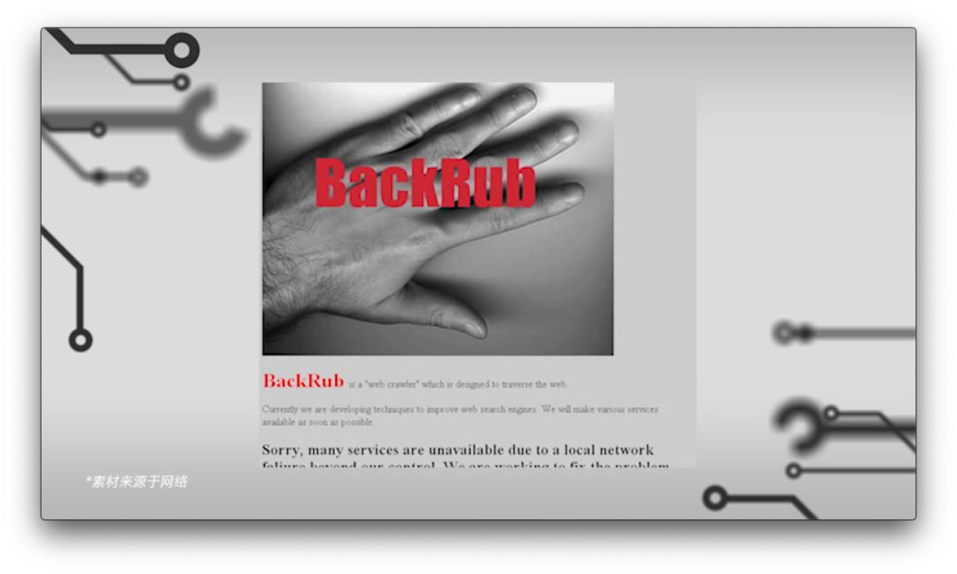 依靠着 PageRank 的算法,Larry Page 和 Sergey Brin 创建了一个叫 BackRub 的网站,这正是谷歌的前身。