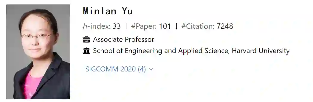 Minlan Yu 是哈佛大学工程与应用科学学院副教授。她于 2006 年获得北京大学计算机科学和数学学士学位,2008 年和 2011 年获得普林斯顿大学计算机科学硕士和博士学位。之后,她成为加州大学伯克利分校的博士后学者,并在南加州大学和耶鲁大学任教。她积极与谷歌、AT&T、微软、Facebook 和贝尔实验室等公司合作。她的研究兴趣包括数据网络、分布式系统、企业和数据中心网络、网络虚拟化和软件定义的网络。2011 年获得 ACM SIGCOMM 博士论文奖,2015 年获得 NSF 职业奖。她曾担任 NSDI 2019 和其他几次会议和研讨会的 PC 联合主席。本届会议也有 4 篇论文入选。