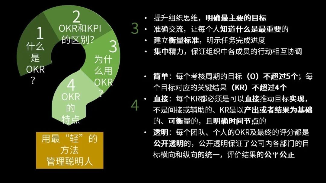 在OKR管理下,每位成员拥有较大的自由完成工作目标,整个团队处于一种自我运营的活跃健康的状态,即用最“轻”的方法管理一群聪明的人。