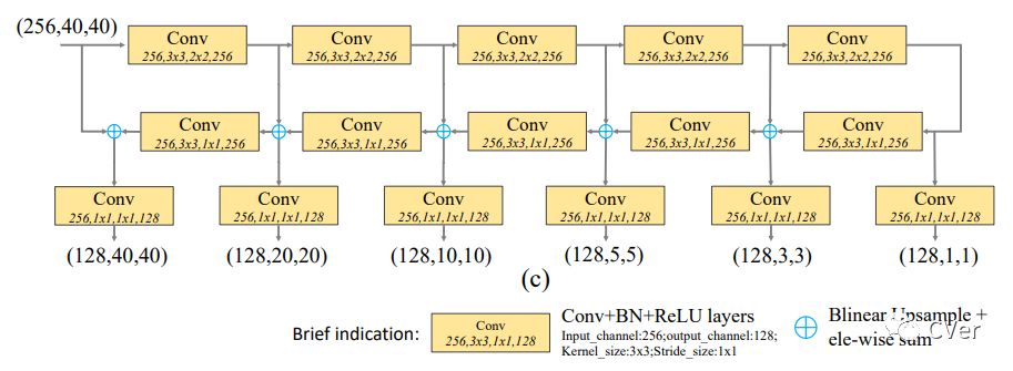 MLFPN的默认配置包含有8个TUM,每个TUM包含5个跨步卷积核5个上采样操作,所以每个TUM的输出包含了6个不同scale的特征。