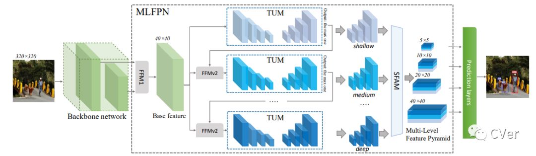 M2Det使用主干网络+MLFPN来提取图像特征,然后采用类似SSD的方式预测密集的包围框和类别得分,通过NMS得到最后的检测结果。