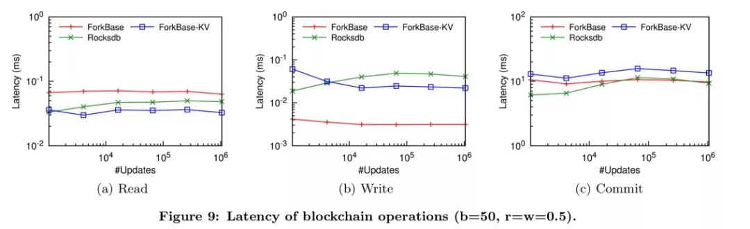 在这些扫描操作中,ForkBase显示出最大的性能优势。如果我们考虑延迟和吞吐量,基于ForkBase的Hyperledger实现和基于Rocksdb的Hyperledger实现非常接近。(下图中的ForkBase-KV是Hyperledger使用ForkBase作为纯粹的键值存储系统,并没有充分利用任何高级功能)。
