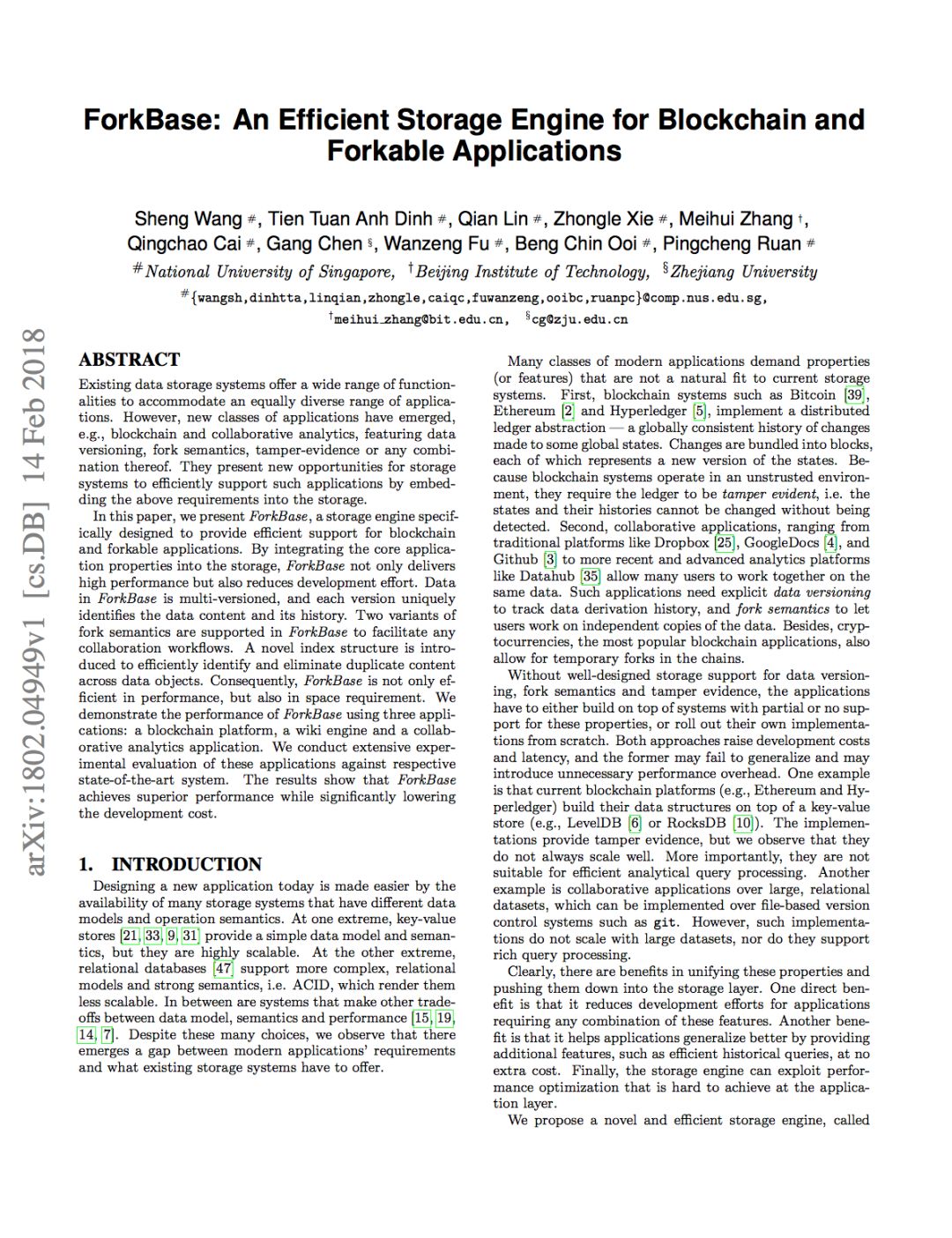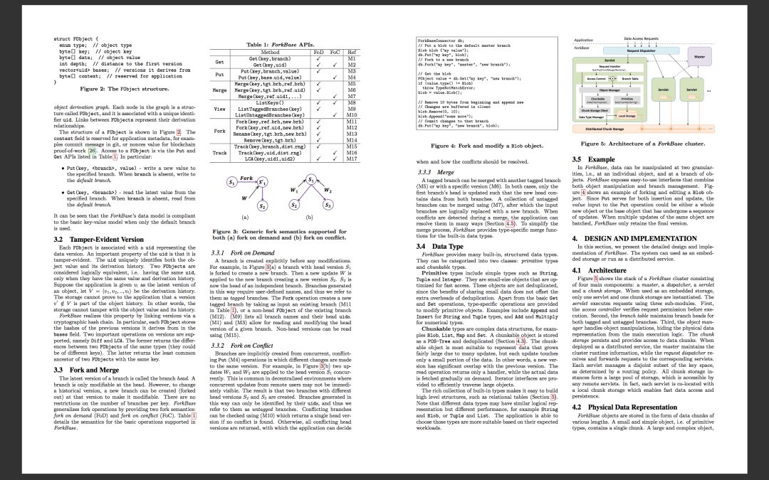 ForkBase是一种数据存储系统,旨在支持需要数据版本控制、分叉和防篡改等功能的应用。一个主要的例子就是区块链系统,但这还可能包括协作应用,比如GoogleDocs。举例说,如今以太坊和HyperLedger的数据结构就直接建立在键值存储系统上。ForkBase力求改而将上述这些属性一路推送到存储层: