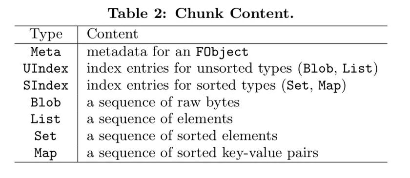 ForkBase选择了在块级进行基于内容的重复数据删除。与文件系统中使用的类似技术相比,ForkBase使用更小的块和可感知数据结构的分块策略。比如说,一个列表只会在元素边界处被拆分,那样根本不需要用多个块来重构列表项。ForkBase可识别许多不同类型的块,每种类型的块都由cid作为独特的标识,cid就是块内容的哈希。