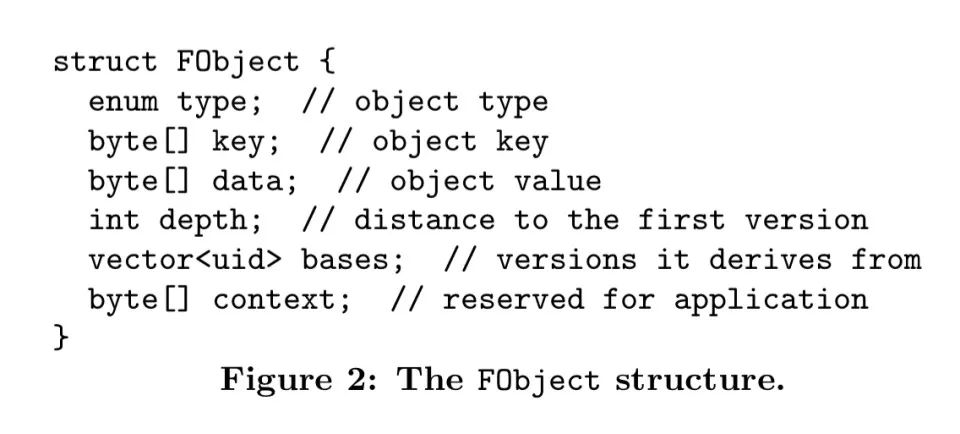 FObject的uid是对象的值及其衍生历史的独特标识。因此,逻辑对等要求对象不仅有同样的值,还有同样的历史记录。诸版本用加密哈希链连接起来,确保能够检测到企图篡改的任何行为。每个FObject存储它从bases字段获得的之前版本的哈希。