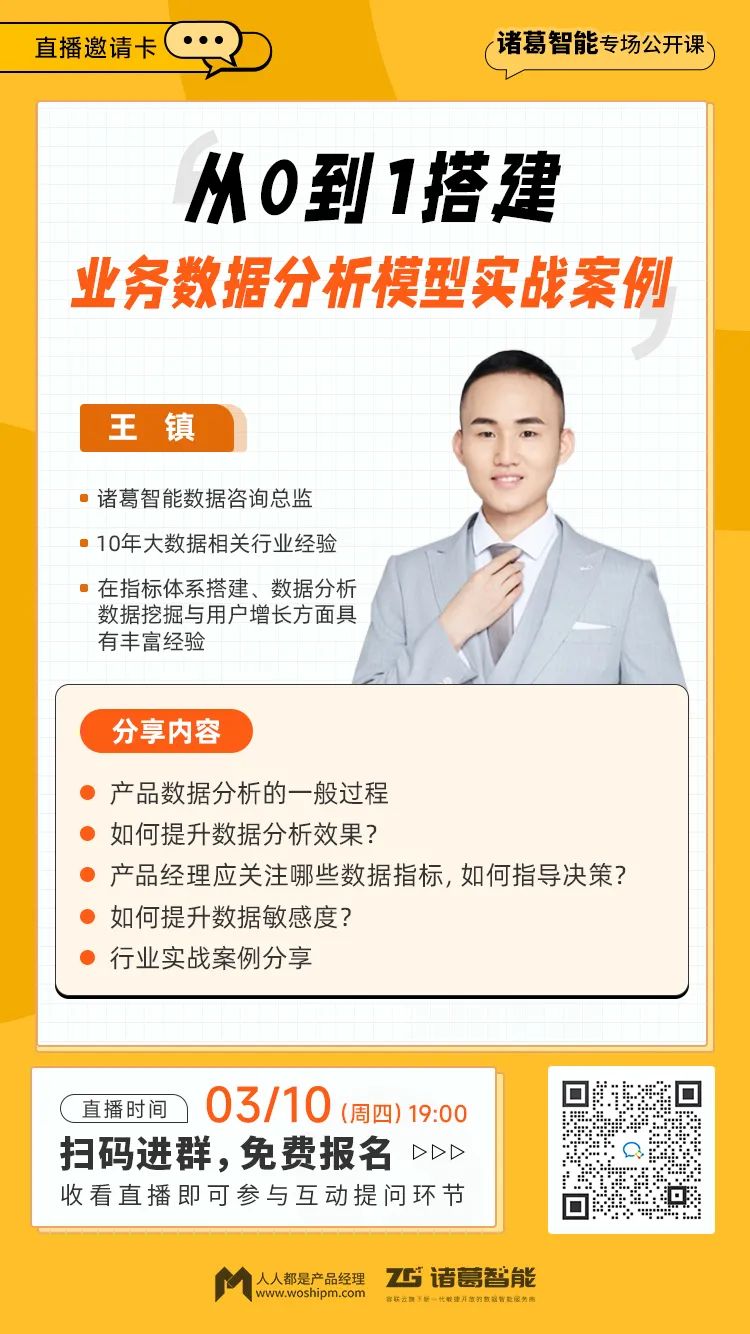 为此,3月10日(周四)19:00-20:00,诸葛io专场公开课,我们就邀请到了诸葛智能数据咨询总监@王镇,通过具体的行业实战案例,来聊聊如何从0到1搭建业务数据分析模型。