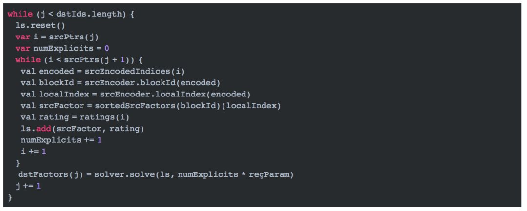 我们知道求解商品值时,我们需要通过所有和商品关联的用户向量信息来构建最小二乘问题。这里有两个选择,第一是扫一遍InBlock信息,同时对所有的产品构建对应的最小二乘问题; 第二是对于每一个产品,扫描InBlock信息,构建并求解其对应的最小二乘问题。第一种方式复杂度较高,具体的复杂度计算在此不作推导。spark选取第二种方法求解最小二乘问题,同时也做了一些优化。 做优化的原因是二种方法针对每个商品,都会扫描一遍InBlock信息,这会浪费较多时间,为此,将InBlock按照商品id进行排序(前文已经提到过),我们通过一次扫描就可以创建所有的最小二乘问题并求解。 构建代码如下所示: