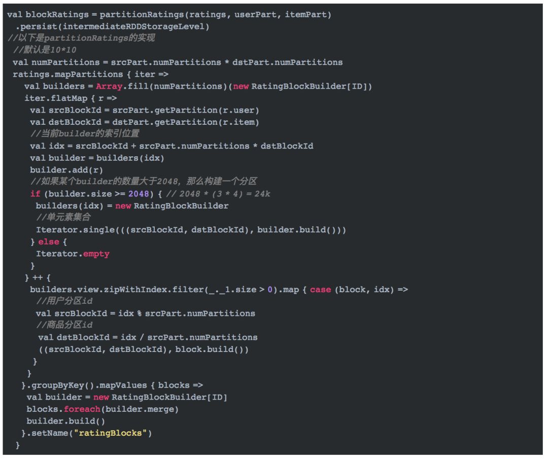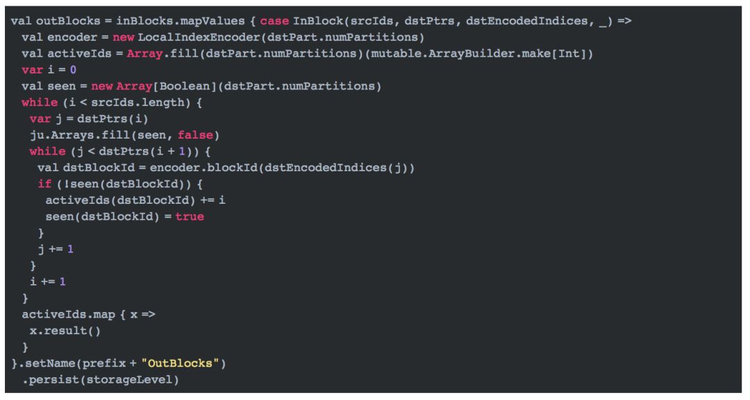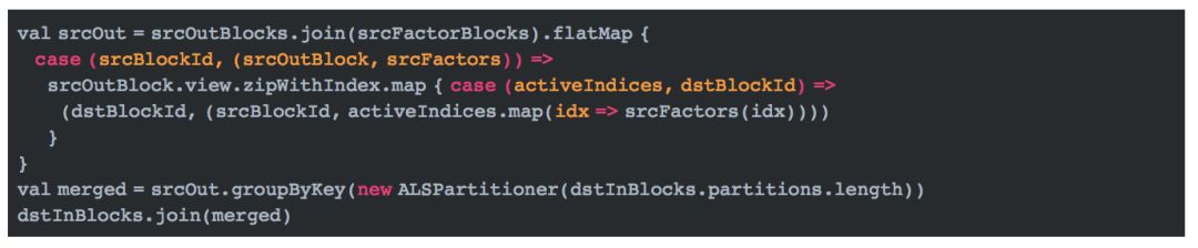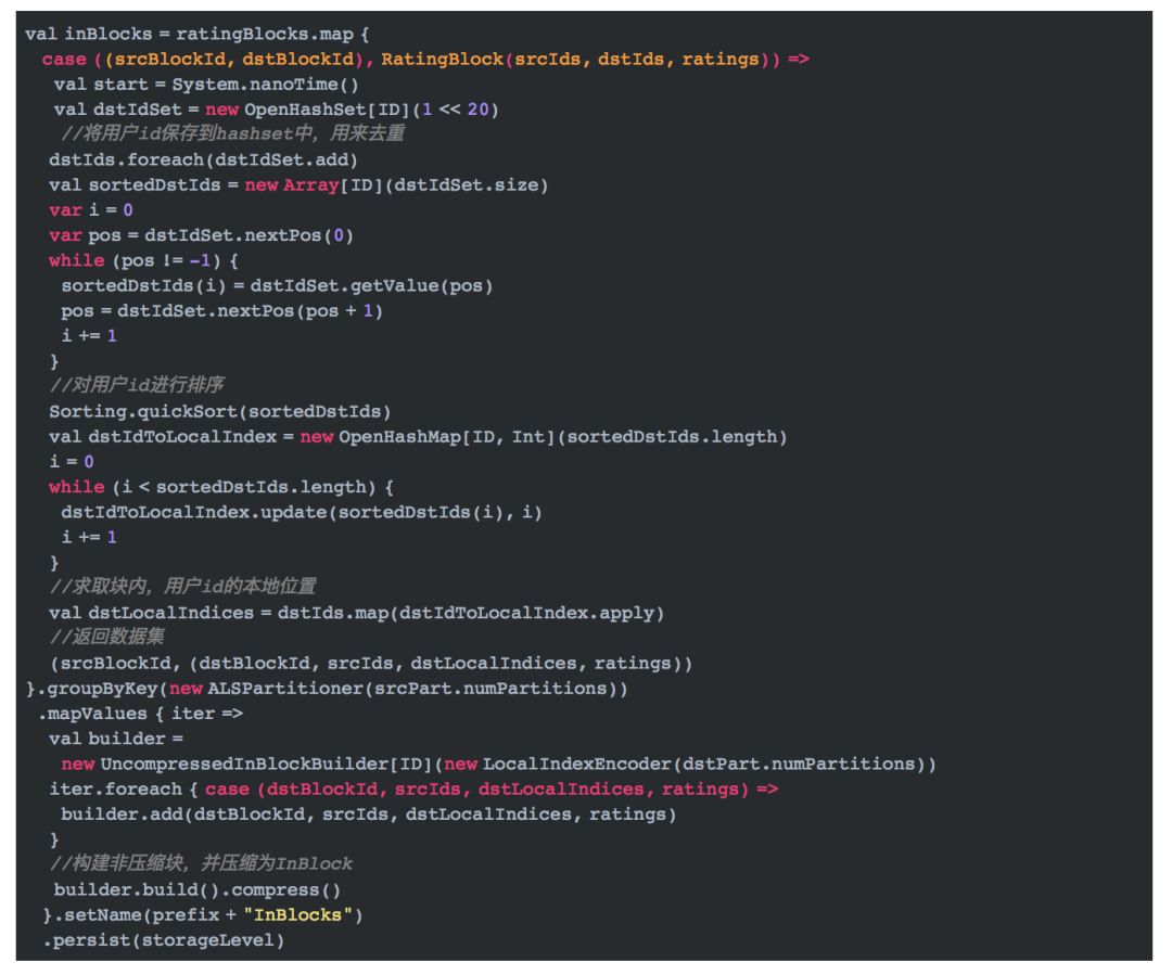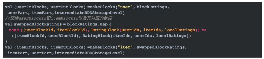 这段代码中,inBlocks表示用户的输入分区块,格式为(用户分区id,(不重复的用户id集,用户位置偏移集,商品id集对应的编码集,打分集))。 activeIds表示商品分区中涉及的用户id集,也即上文所说的需要发送给确定的商品分区的用户信息。activeIds是一个二维数组,第一维表示分区,第二维表示用户id集。用户OutBlocks的最终格式是(用户分区id,OutBlocks)。
