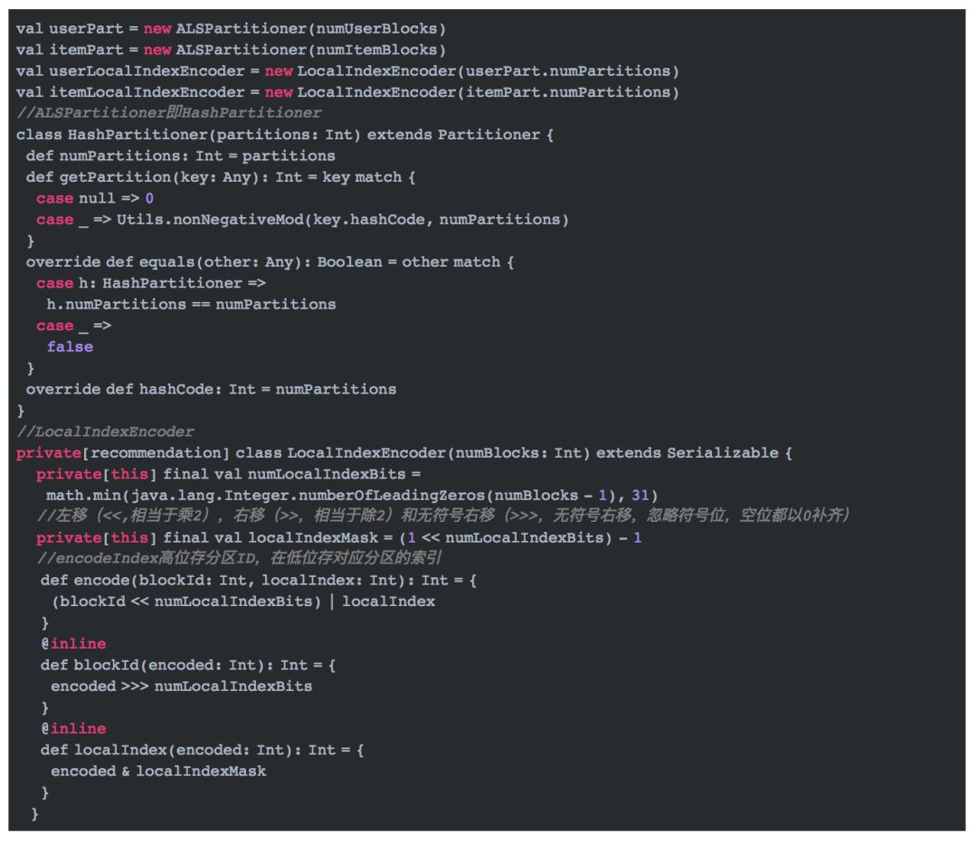 ALSPartitioner实现了基于hash的分区,它根据用户或者商品id的hash值来进行分区。LocalIndexEncoder对(blockid,localindex)即(分区id,分区内索引)进行编码,并将其转换为一个整数,这个整数在高位存分区ID,在低位存对应分区的索引,在空间上尽量做到了不浪费。 同时也可以根据这个转换的整数分别获得blockid和localindex。这两个对象在后续的代码中会用到。