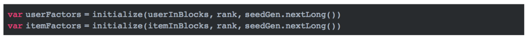 初始化后的userFactors的格式是(用户分区id,用户特征矩阵factors),其中factors是一个二维数组,第一维的长度是用户数,第二维的长度是rank数。初始化的值是异或随机数的F范式。itemFactors的初始化与此类似。