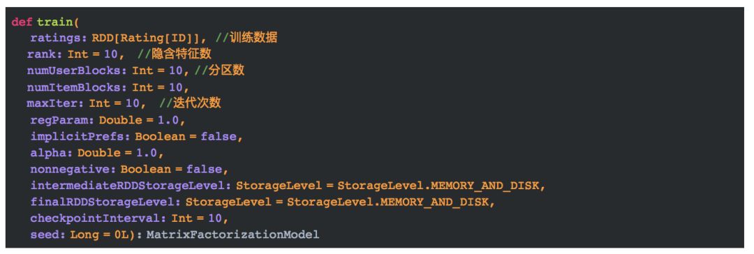 从代码中我们知道,训练模型用到了ALS.scala文件中的train方法,下面我们将详细介绍train方法的实现。在此之前,我们先了解一下train方法的参数表示的含义。