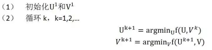 公式(2.1)和公式(2.4)是非凸函数,无法求解最优解。但是,固定公式中的用户-特征向量或者商品-特征向量,公式就会变成二次方程,可以求出全局的极小值。交替最小二乘的计算过程是:交替的重新计算用户-特征向量和商品-特征向量,每一步都保证降低损失函数的值,直到找到极小值。 交替最小二乘法的处理过程如下所示: