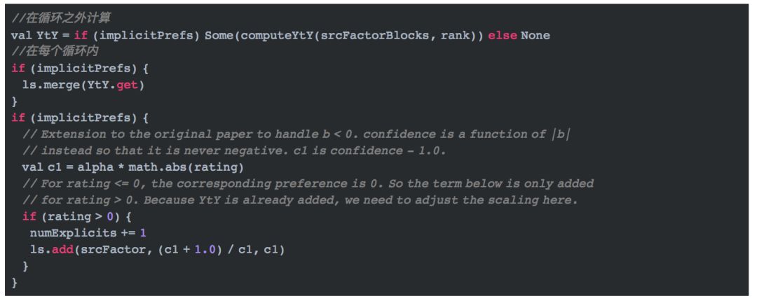 到了这一步,构建显式反馈算法的最小二乘就结束了。隐式反馈算法的实现与此类似,不同的地方是它将YtY这个值预先计算了(可以参考文献【1】了解更多信息),而不用在每次迭代中都计算一遍。代码如下: